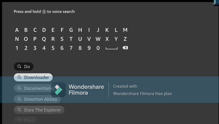 2) Type in the initial letters of ‘Downloader’ in the search bar, then use the arrow keys and the Enter button on your remote to select the matching result.